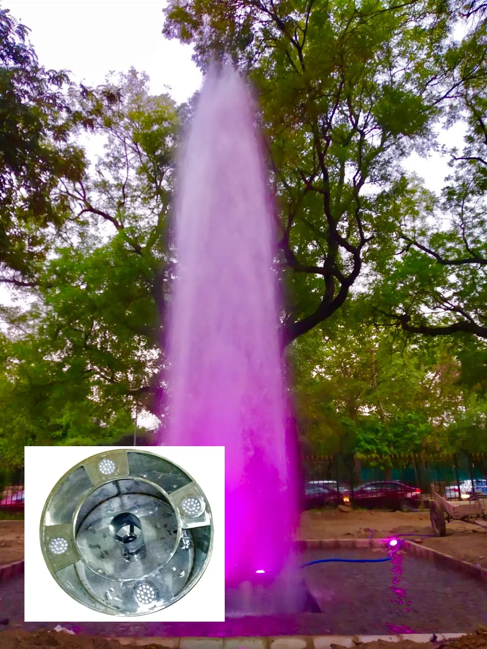 Application: Outdoors installation with very thick & high Volcano effect of frothy water, suitable for large size public parks, Rotary, Commercial place, Residential entry gate welcome fountain. It give 25-30 feet high water effect like Volcano shape & looks spectacular in night when illuminated with inbuilt colour changing LED Lights.